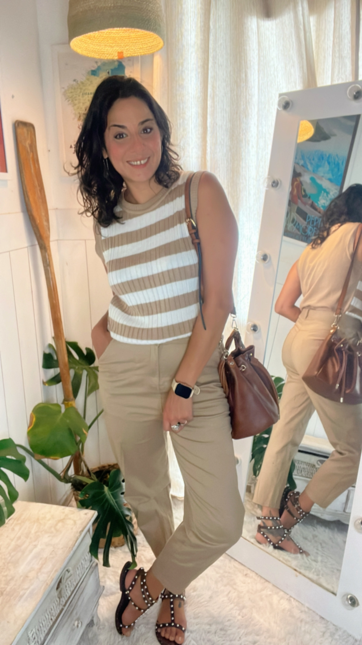 Regata gola redonda, fininha, soltinha, comprimento tradicional, costas lisas no tom escuro, e frente listrada e com canelado para dar mais interessancia e textura longitudinal pras listras horizontais,