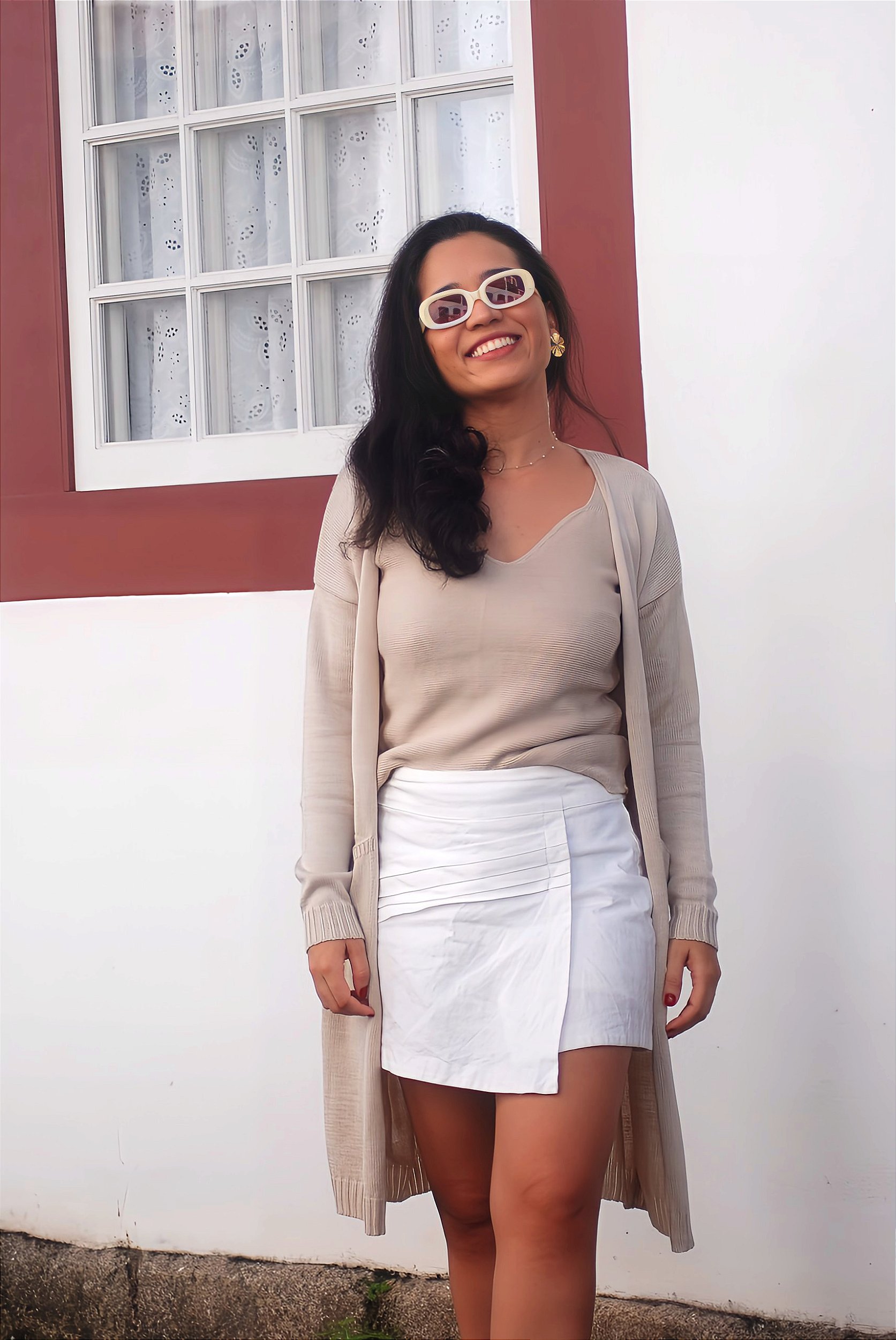 Do mesmo fio da Pantalona Nice e da Blusa Twiggy, é fio maleável, fino, que não faz volume na mala, não esquenta, é bom para dar abrigadinha da brisa da noite, no trabalho no ar condicionado, para criar efeito terceira peça nos looks, fica charmoso com shorts alfaiataria ou vestidos curtos, dando novo comprimento no visual. Combina com calças justas ou soltas, dependendo da casualidade que você propõe.
